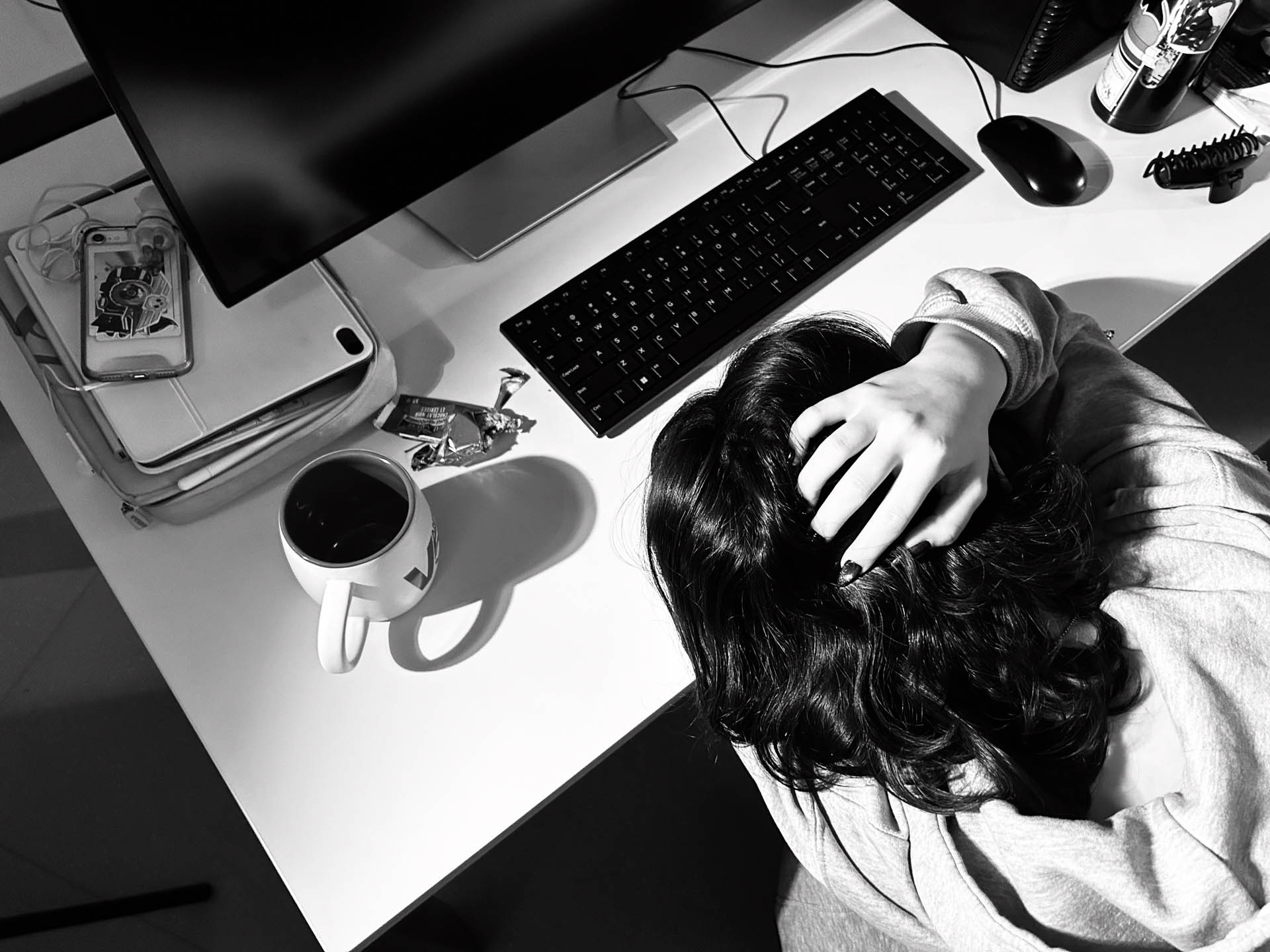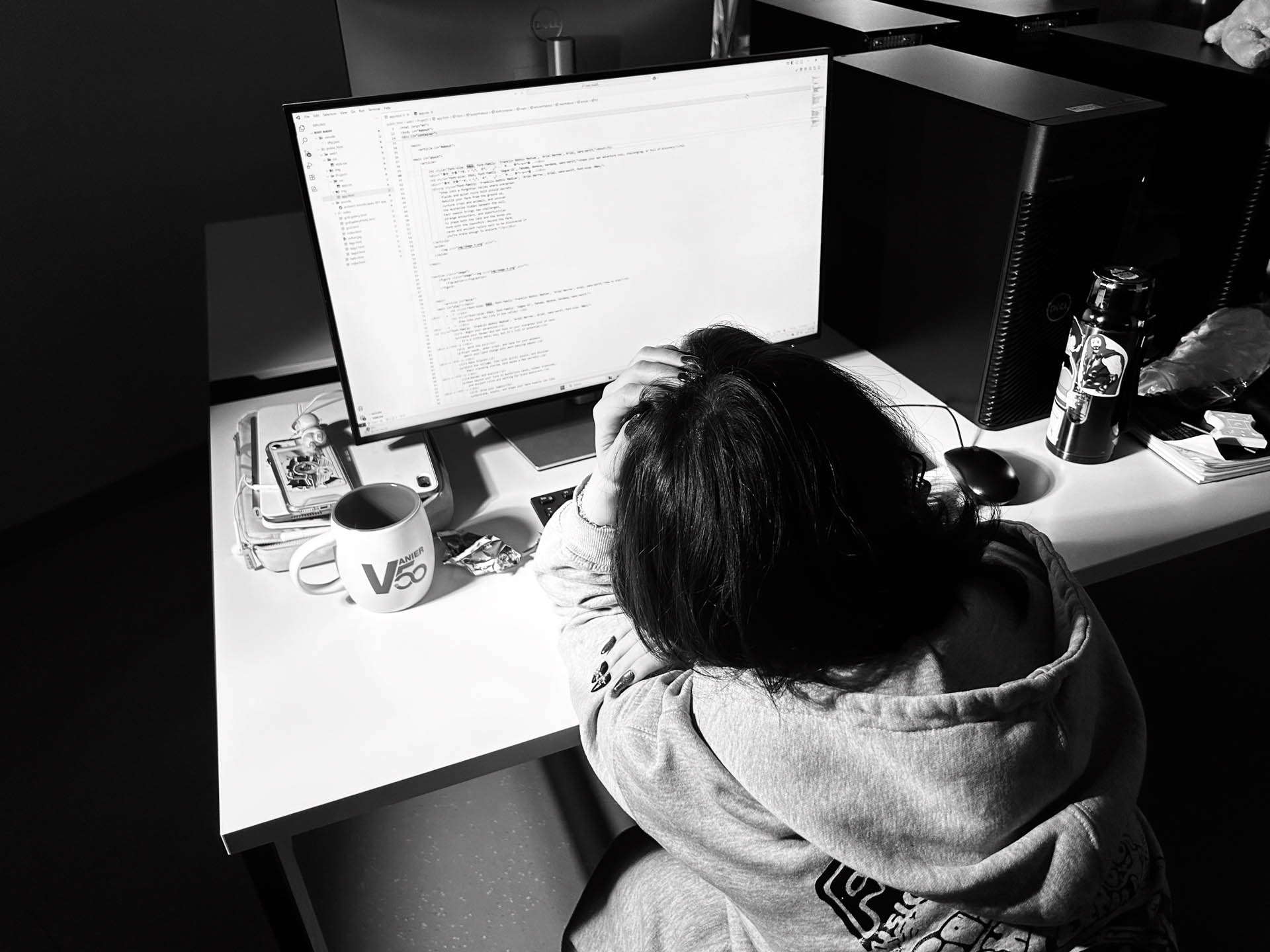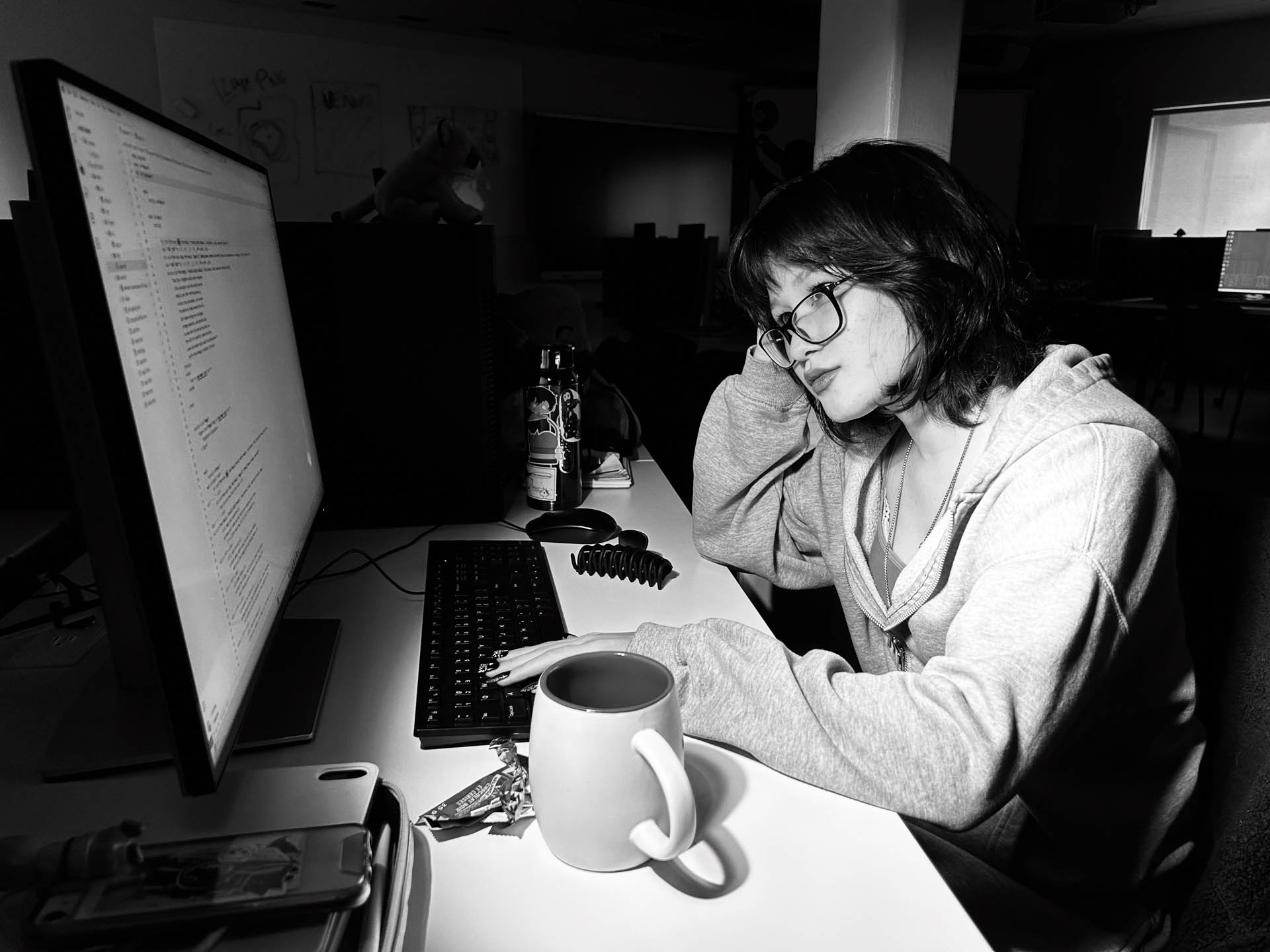 She gets up to make coffee in the kitchenette, but when she returns, her computer screen has gone black and won't turn back on.