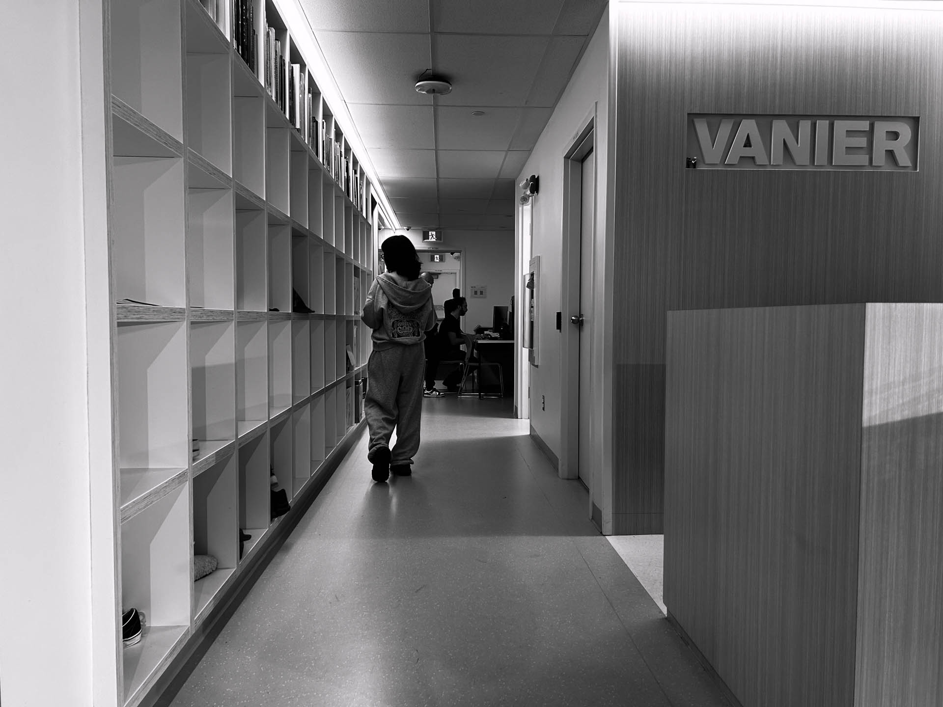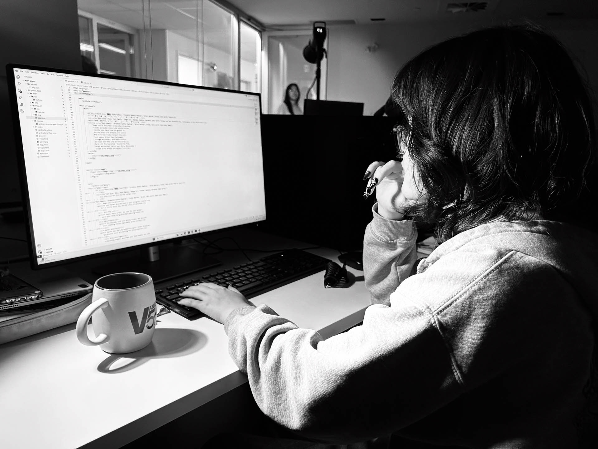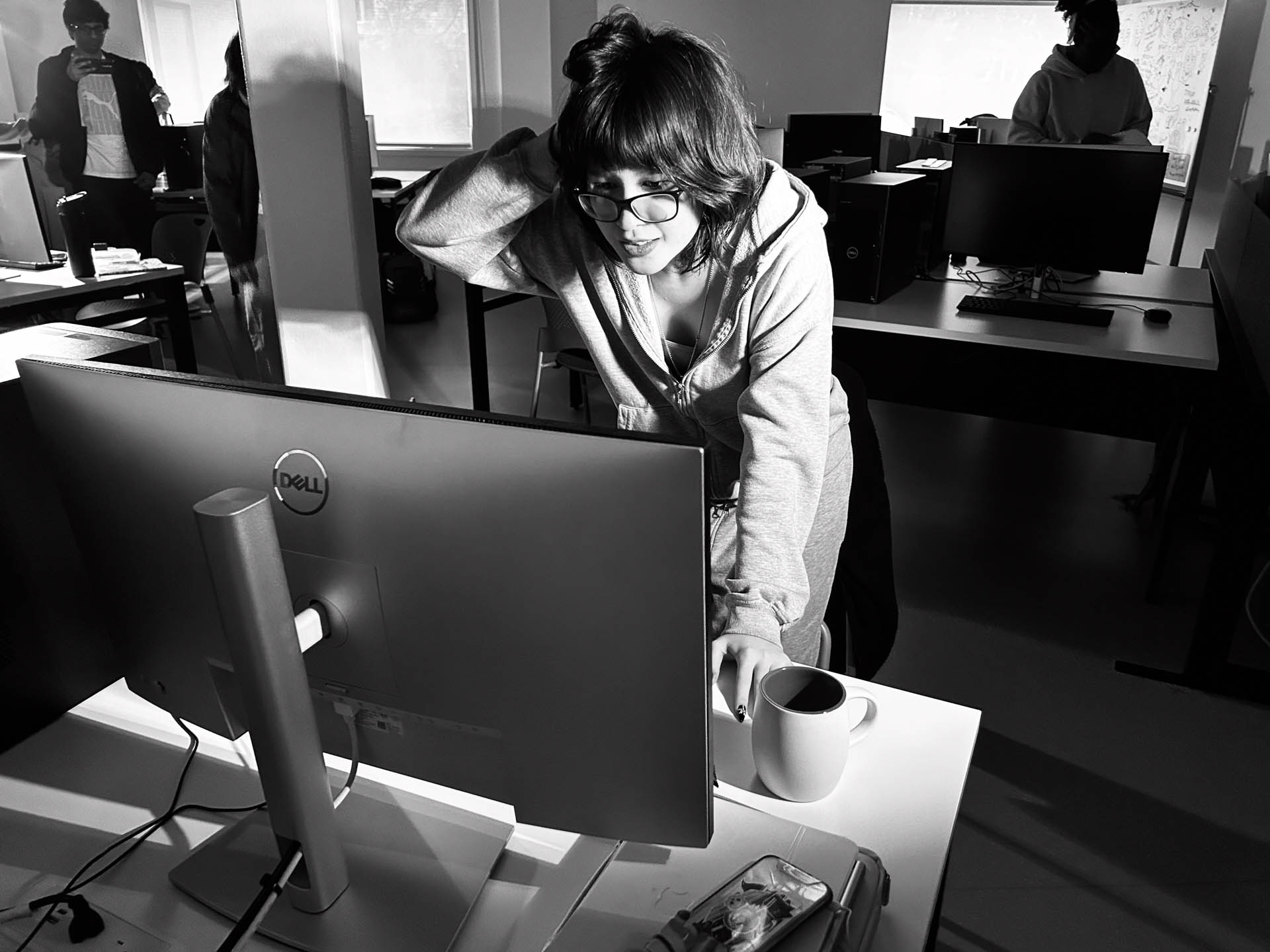 A student stays late in the computer lab, focused on finishing a project as the building grows quiet.