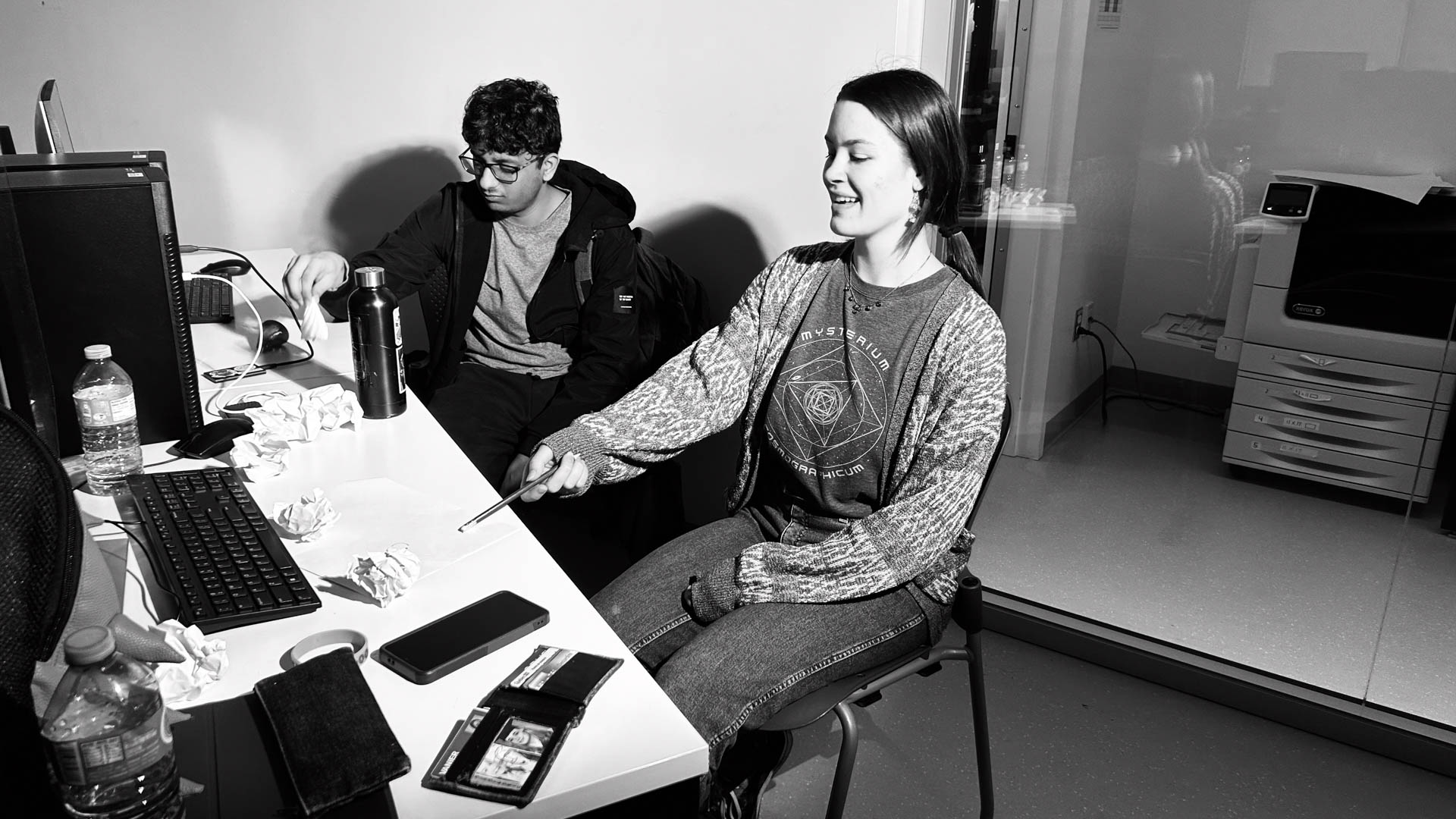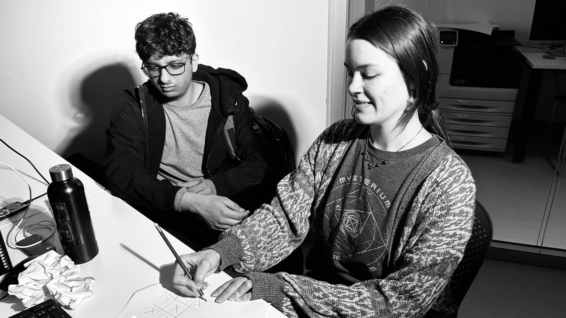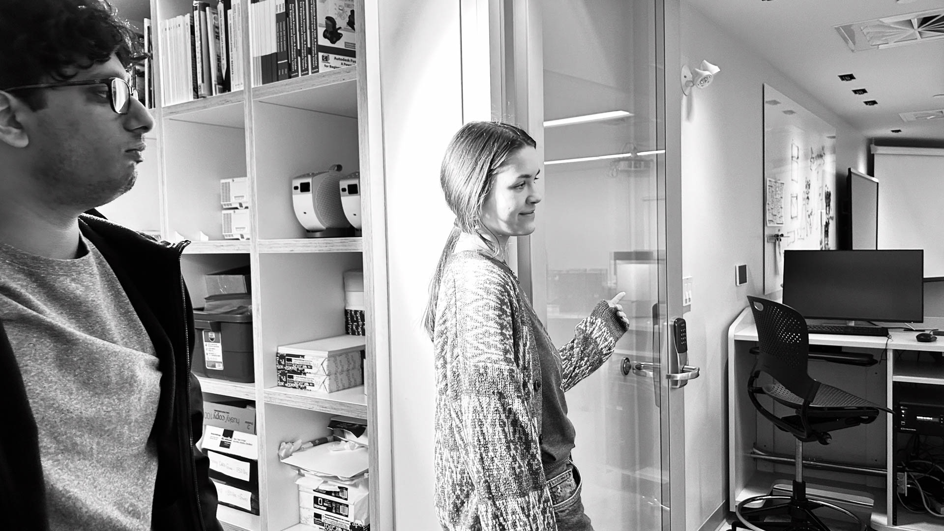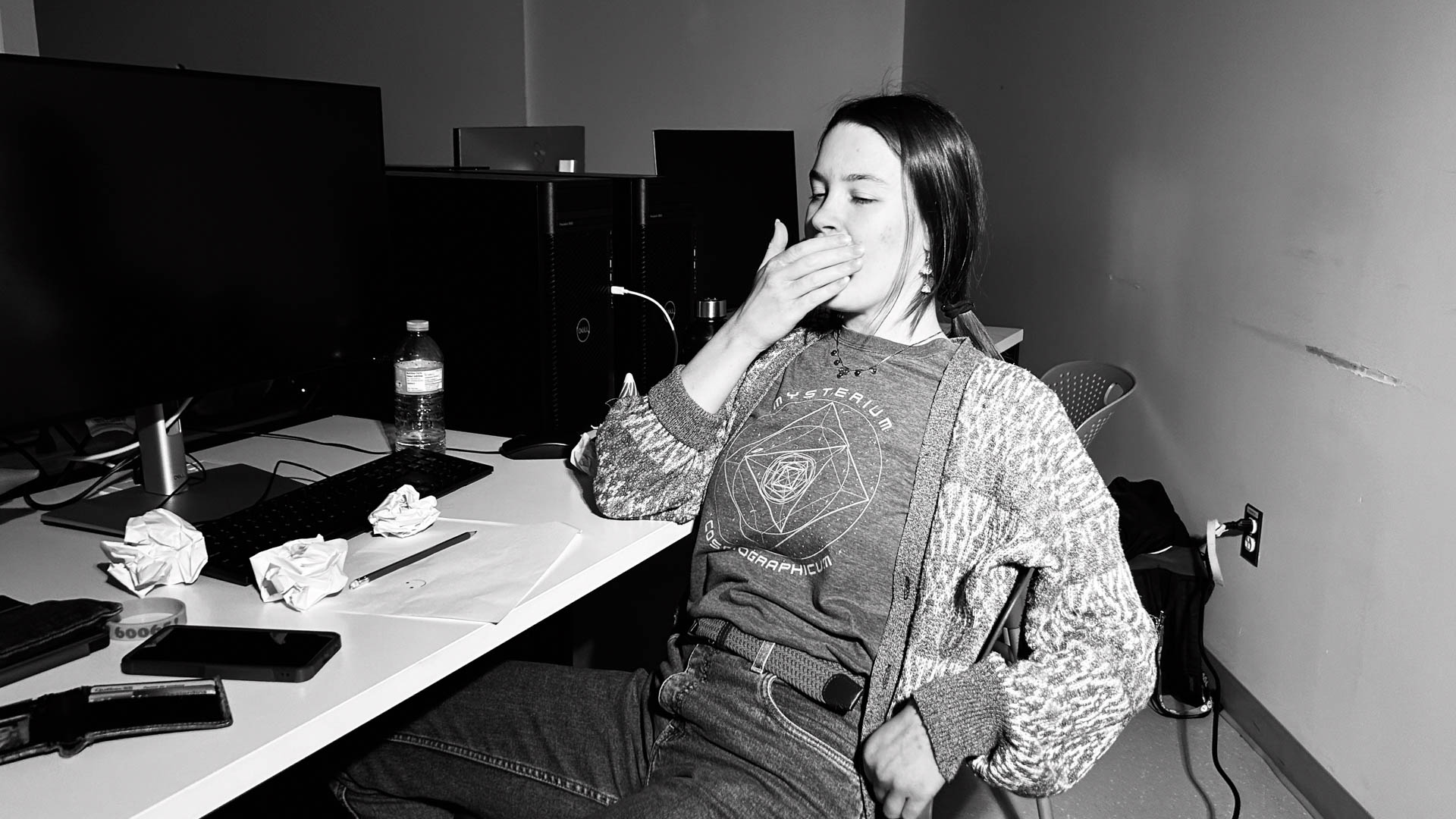 A student works quietly in the computer lab, tired, she decides to go outside for a quick break & stretch. She realizes her phone and keys are still on the desk inside. Suddenly her ex bf arrives and lets her in, she still likes him but hes trying to move on, she insists that they play tic-tac-toe to break the ice.