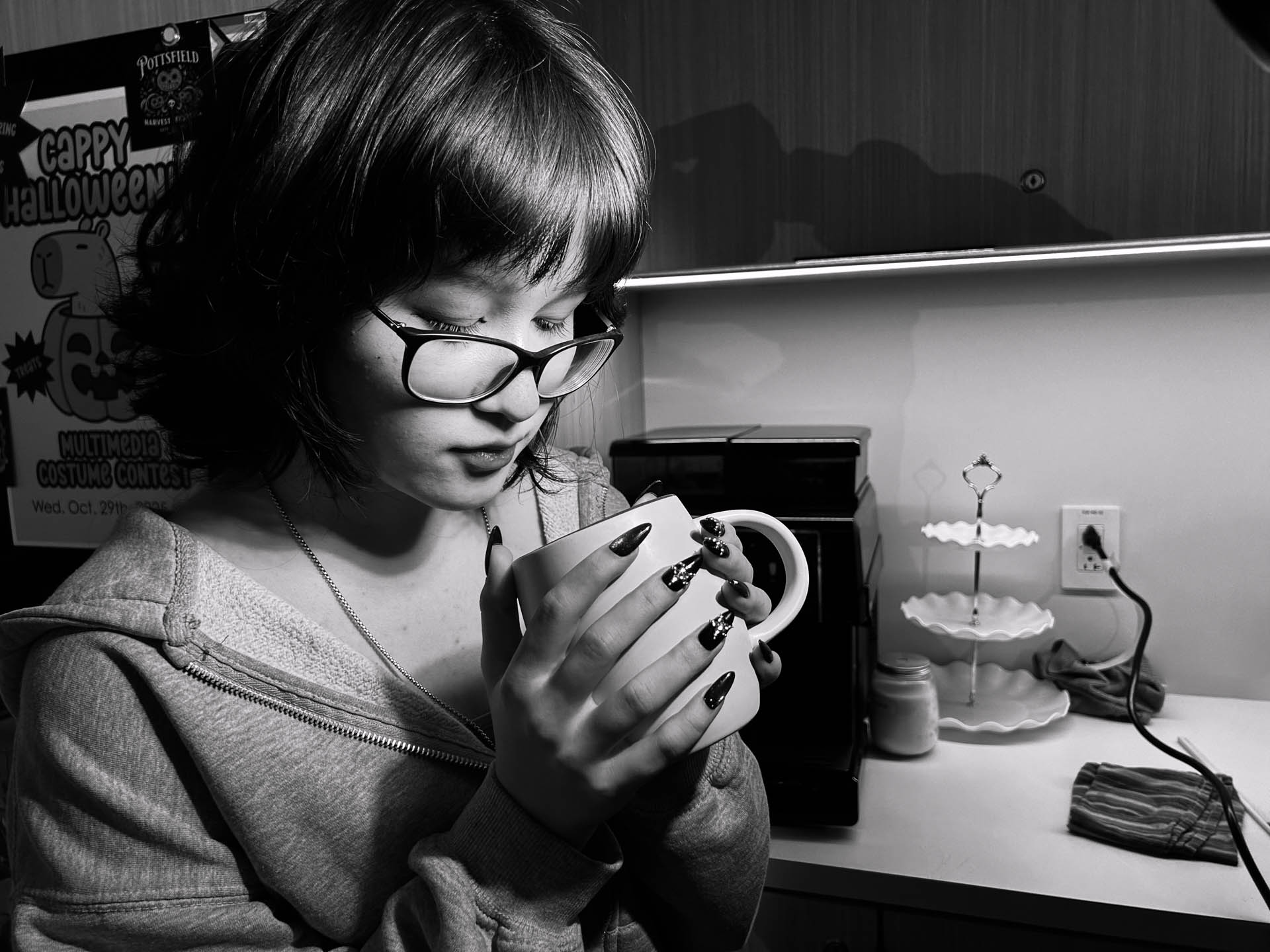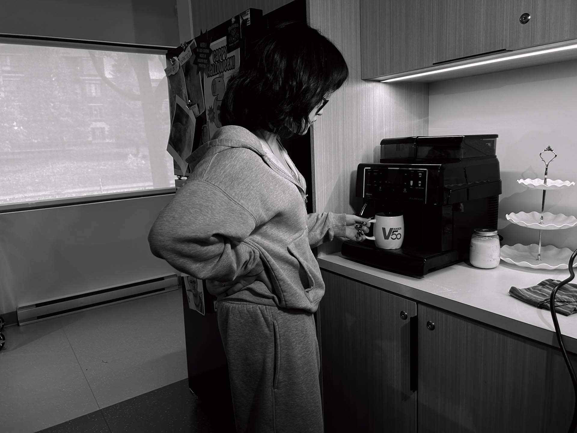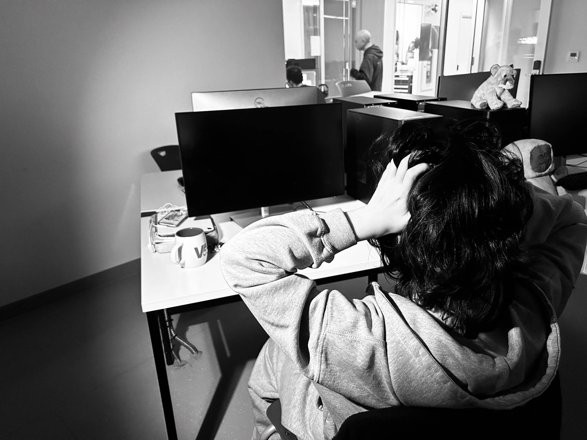 She gets up to make coffee in the kitchenette, but when she returns, her computer screen has gone black and won't turn back on.