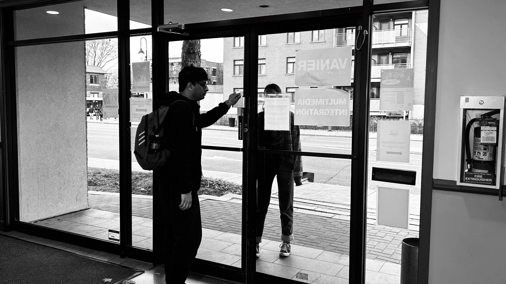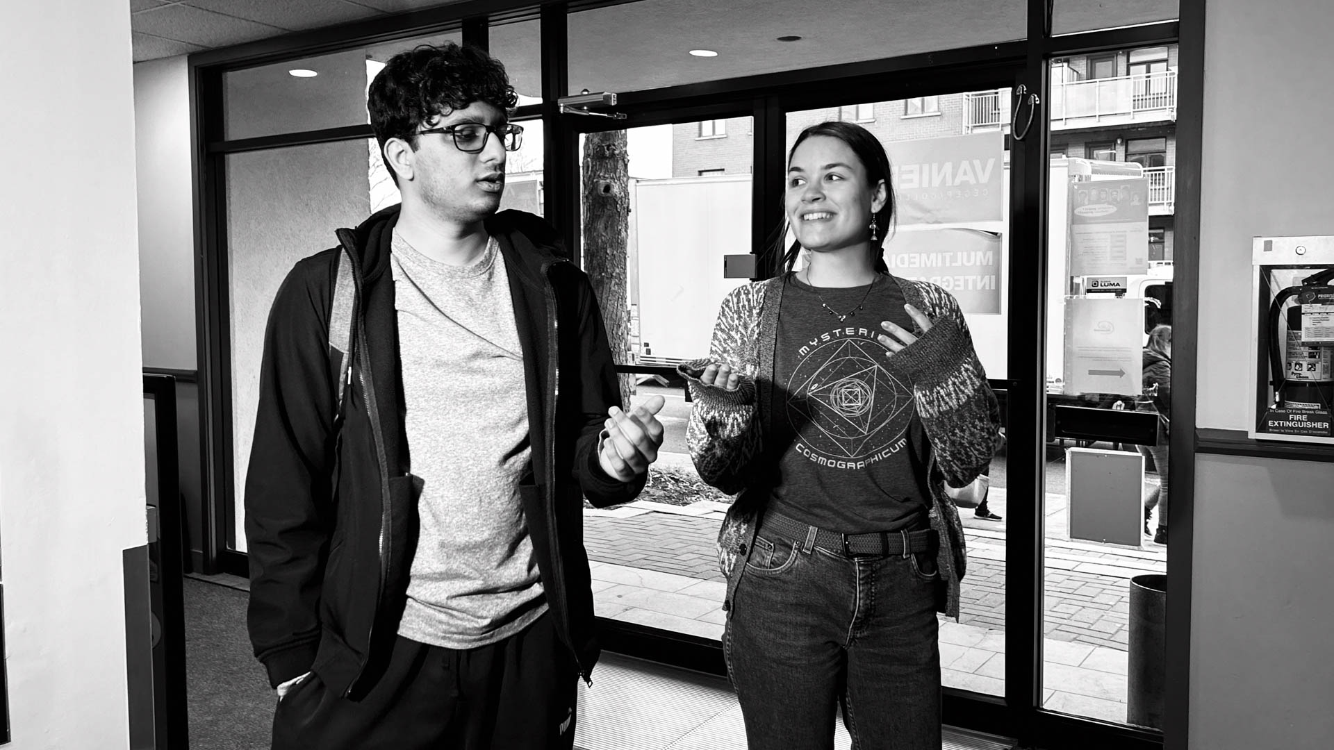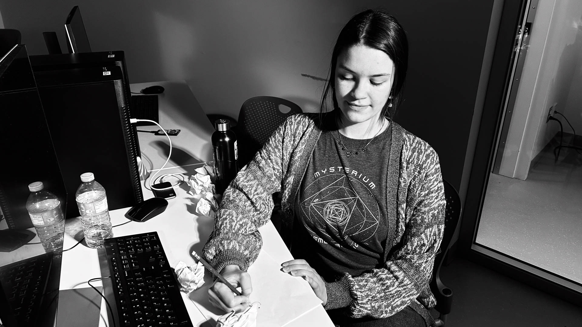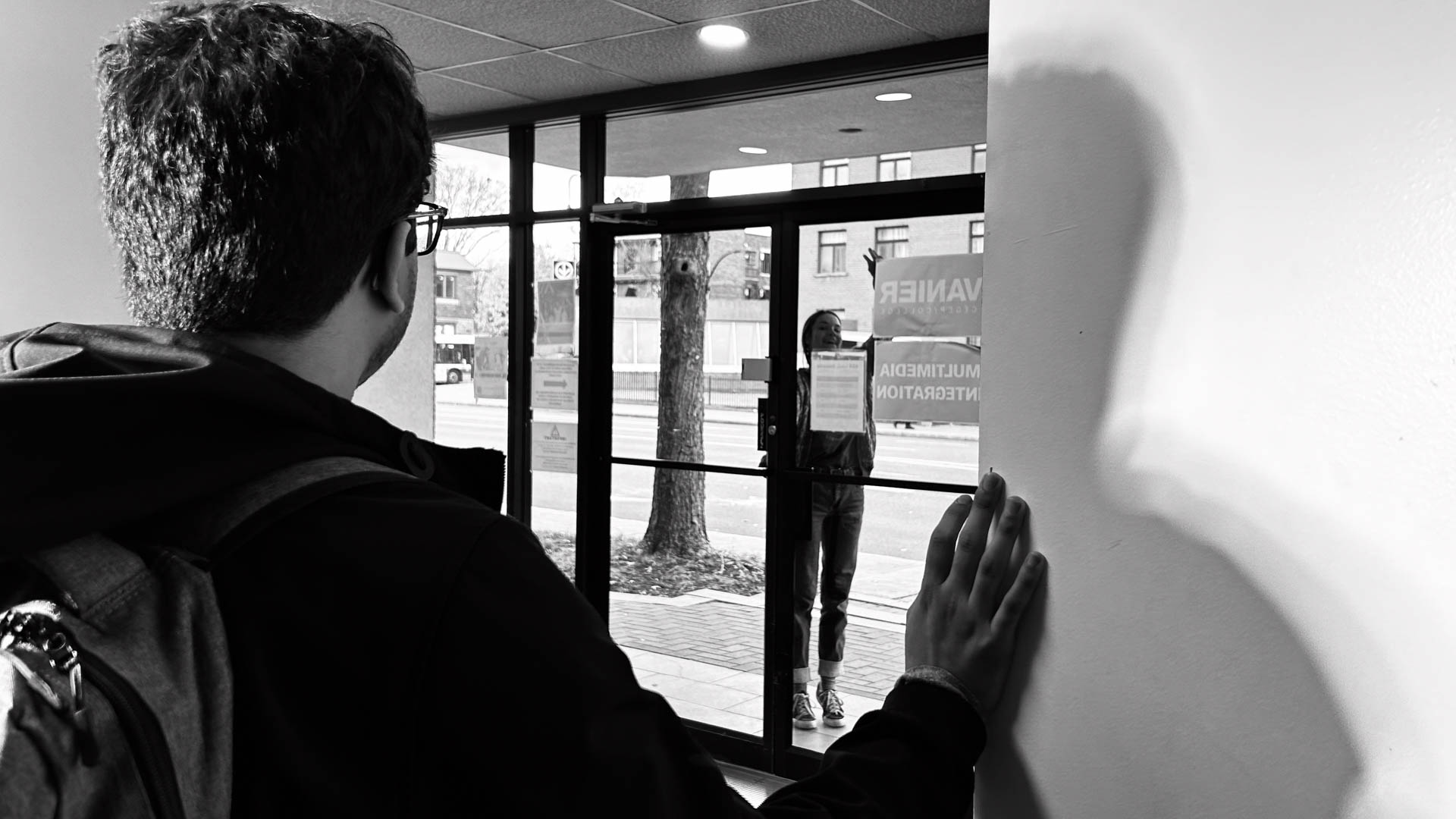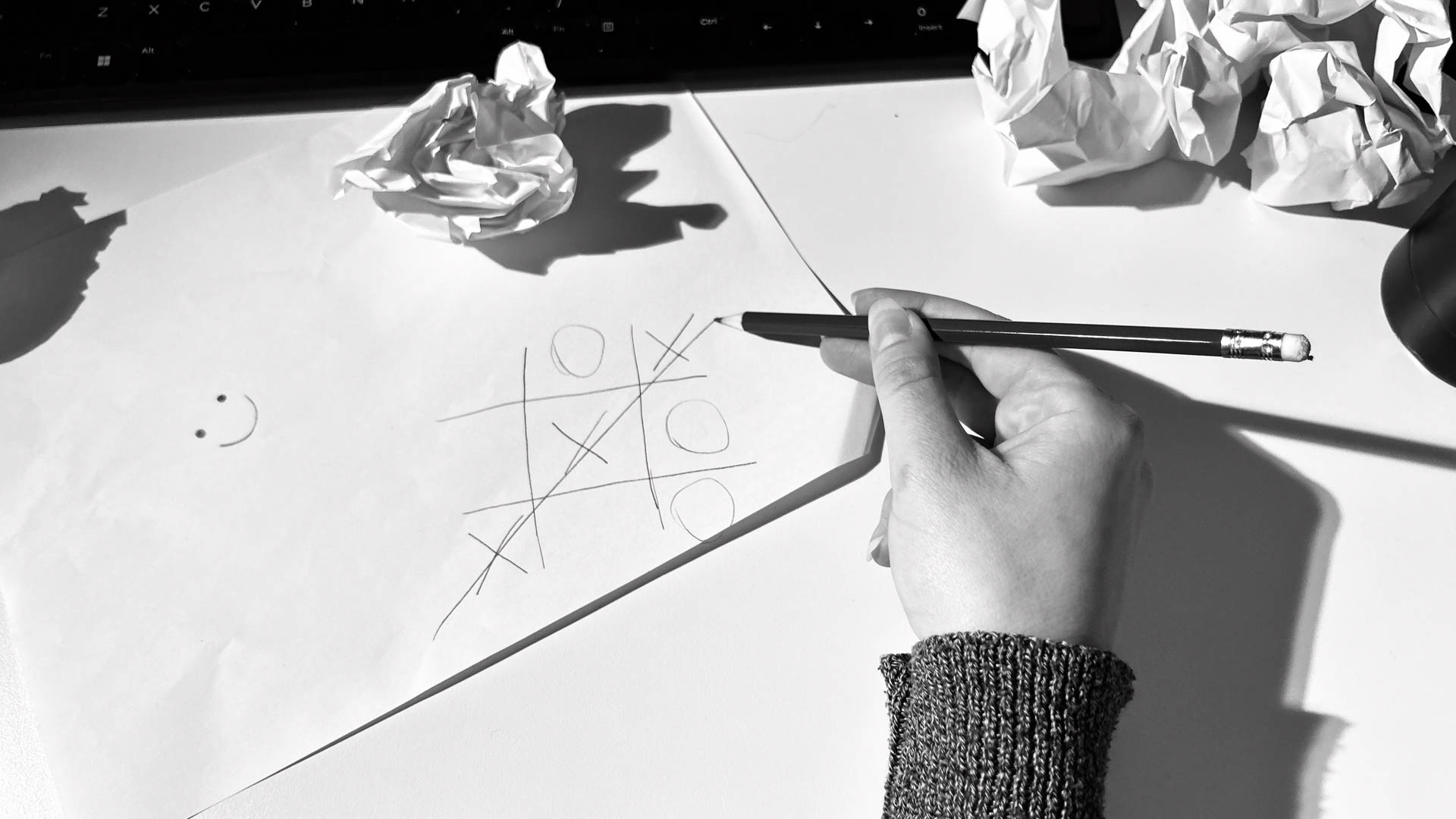 A student works quietly in the computer lab, tired, she decides to go outside for a quick break & stretch. She realizes her phone and keys are still on the desk inside. Suddenly her ex bf arrives and lets her in, she still likes him but hes trying to move on, she insists that they play tic-tac-toe to break the ice.